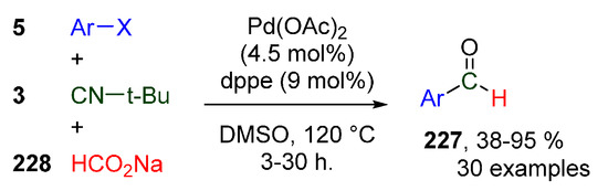 - Jiang, X.; Wang, J.-M.; Zhang, Y.; Chen, Z.; Zhu, Y.-M.; Ji, S.-J. Palladium-Catalyzed Formylation of Aryl Halides with tert-Butyl Isocyanide. Org. Lett. 2014, 16, 3492–3495. [Google Scholar] [CrossRef] [PubMed]