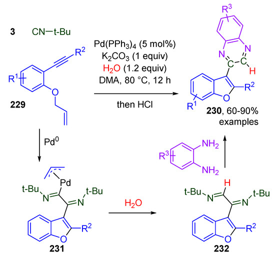 - Hu, W.; Li, M.; Jiang, G.; Wu, W.; Jiang, H. Synthesis of 2,3-Difunctionalized Benzofuran Derivatives through Palladium-Catalyzed Double Isocyanide Insertion Reaction. Org. Lett. 2018, 20, 3500–3503. [Google Scholar] [CrossRef]