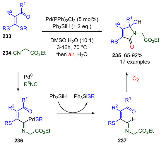 - Chang, J.; Liu, B.; Yang, Y.; Wang, M. Pd-Catalyzed C-S Activation/Isocyanide Insertion/Hydrogenation Enables a Selective Aerobic Oxidation/Cyclization. Org. Lett. 2016, 18, 3984–3987. [Google Scholar] [CrossRef]