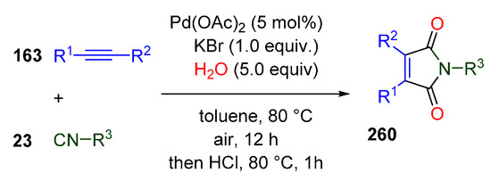 - Hu, W.; Zheng, J.; Li, J.; Liu, B.; Wu, W.; Liu, H.; Jiang, H. Assembly of Polysubstituted Maleimides via Palladium-Catalyzed Cyclization Reaction of Alkynes with Isocyanides. J. Org. Chem. 2016, 81, 12451–12458. [Google Scholar] [CrossRef]