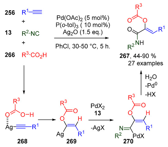 - Gao, M.; Zou, M.; Wang, J.; Tan, Q.; Liu, B.; Xu, B. Palladium-Catalyzed Multicomponent Reaction of Alkynes, Carboxylic Acids, and Isocyanides: A Direct Approach to Captodative Olefins. Org. Lett. 2019, 21, 1593–1597. [Google Scholar] [CrossRef]