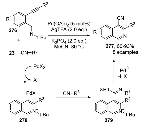 - Qiu, G.; Qiu, X.; Wu, J. Generation of 4-Cyanoisoquinolines and 4-Amidylisoquinolines via a Palladium-Catalyzed Cyanative Reaction of 2-Alkynylbenzaldimines with Isocyanides. Adv. Synth. Catal. 2013, 355, 3205–3209. [Google Scholar] [CrossRef]