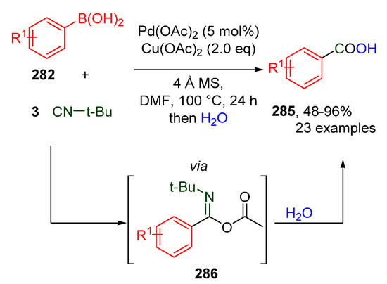 - Chen, Z.-B.; Liu, K.; Zhang, F.-L.; Yuan, Q.; Zhu, Y.-M. Palladium-catalyzed oxidative coupling of arylboronic acid with isocyanide to form aromatic carboxylic acids. Org. Biomol. Chem. 2017, 15, 8078–8083. [Google Scholar] [CrossRef]