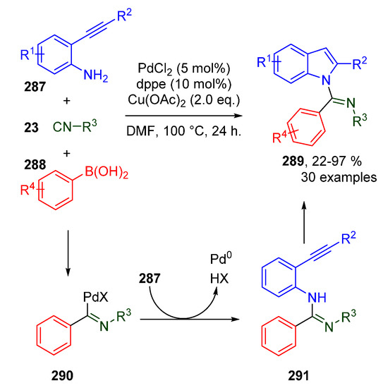 - Tao, S.-W.; Zhou, J.-Y.; Liu, R.-Q.; Zhu, Y.-M. One-Pot Synthesis of N-Imidoyl-(1H)-indoles via Palladium-Catalyzed Oxidative Insertion Domino Reaction with Isocyanide and Arylboronic Acid. J. Org. Chem. 2019, 84, 8121–8130. [Google Scholar] [CrossRef]