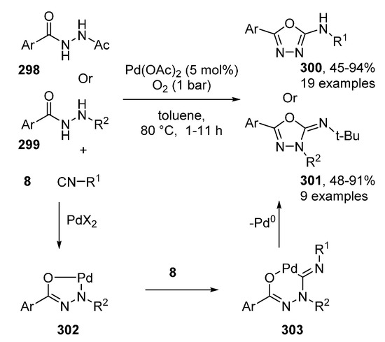 - Fang, T.; Tan, Q.; Ding, Z.; Liu, B.; Xu, B. Pd-Catalyzed Oxidative Annulation of Hydrazides with Isocyanides: Synthesis of 2-Amino-1,3,4-oxadiazoles. Org. Lett. 2014, 16, 2342–2345. [Google Scholar] [CrossRef]
