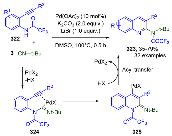 - Li, M.; Zheng, J.; Hu, W.; Li, C.; Li, J.; Fang, S.; Jiang, H.; Wu, W. Palladium-Catalyzed Cyclization of N-Acyl-o-alkynylanilines with Isocyanides Involving a 1,3-Acyl Migration: Rapid Access to Functionalized 2-Aminoquinolines. Org. Lett. 2018, 20, 7245–7248. [Google Scholar] [CrossRef] [PubMed]