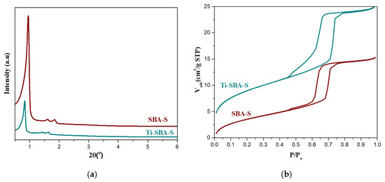(a) Low angle XRD pattern; (b) N2 adsorption-desorption isotherms of “short” SBA-15 materials SBA-S and Ti-SBA-S.