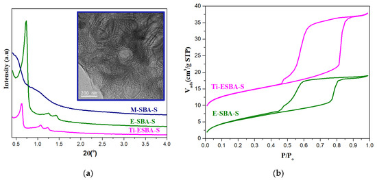 In order to facilitate the adsorption and diffusion rate of bulky molecules, we tried to prepare materials with larger pore diameter than the standard pore size materials. Several experimental methods were attempted, only the most relevant ones are highlighted here. Initially, we tried to expand the pore size of SBA-S using 1, 3, 5-trimethylbenzene (TMB) as a pore expander (sample code M-SBA-S). Figure 3a shows the low angle X-ray diffraction patterns for the synthesized mesoporous silica materials with pore expanders. All XRD peaks of M-SBA-S disappear, suggesting that the addition of (TMB) leads to the loss of the hexagonal arrangement of pores. This may be due to uncontrolled interaction with the triblock copolymers that causes disruption of the micellar phase of P104 producing less ordered mesocellular foam material with a wider pore size [15]. TEM image in the inset of Figure 3a corroborates the ringed multi-lamellar silica vesicles with no open pores and no hexagonal arrangements. This result is less pronounced when using P123, yet it has been discussed in the literature as a result of the pore expansion [16,17]. Therefore, we tried to expand the pore size of both types of materials by using another type of pore expander, 1, 3, 5-triisopropylbenzene (TIPB), which has relatively large size and more hydrophobic group. This characteristic may help the expander to selectively interact with the core of the micelle. Figure 3a shows the low angle X-ray diffraction patterns for the synthesized expanded SBA-15 materials (labeled with “E”) for both silica E-SBA-S and with a small amount of titanocene in the synthesis gel, Ti-E-SBA-S. It can be observed that both E-SBA-S and Ti-E-SBA-S materials exhibit XRD patterns with one very intense diffraction peak (100), and two weak peaks (110) and (200), which are characteristic of 2-dimensional hexagonal p6mm structure with excellent uniformity. The XRD peaks of both materials were shifted towards lower 2θ value (larger ao, see Table 1) when compared to their SBA-S and Ti-SBA-S parent materials. This confirms that TIPB increases the unit cell dimension without affecting the pore arrangement of the material. These materials were further characterized by N2 adsorption-desorption isotherm in order to confirm the pore size difference with the parent material.