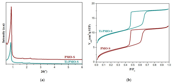 (a) Low angle XRD patterns; (b) N2 adsorption-desorption isotherms of PMO-S and Ti-PMO-S materials.