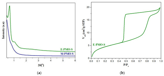 (a) Low angle XRD patterns; (b) N2 adsorption-desorption isotherm of E-PMO-S.