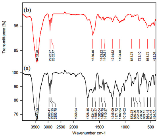 FTIR analyses of nanofiltration membranes before and after their soaking for two months in a 45 wt.% of MDEA solution are shown in Figure 1. The spectrum of membrane before use (a) evidenced, as expected, a peak of 3433 cm−1 indicating the amide N-H vibration stretching and another peak at 1634 cm−1 indicating the presence of amide carbonyl (C=O) bond. Moreover, the peaks at 874 cm−1, 852 cm−1, 793 cm−1, and 726 cm−1 represent the polysulfone structure with aromatic C-H bending, and the peak at 1729 cm−1 is related to the ester groups of polyester [33]. In addition, the overlap of stretching band of N–H (amide groups) and that of carboxylic acid groups (O-H stretching) from the imperfect cross-linking of the polyamide layer lead to the creation of the wide band around 3433 cm−1 [44,45]. The spectrum of the membrane after its soaking for 2 months in 45 wt.% MDEA solution (b) evidenced an overlap of amine peaks (e.g., N-H bending at 1630 cm−1) due to the adsorption of amine on the membrane surface. The amide N-H vibration stretching with the peak at 3433 cm−1 indicated a good chemical stability of the membrane in contact for two consecutive months with a 45 wt.% MDEA solution.