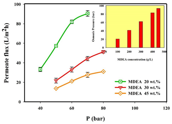 Figure 2 also shows the effects of operating pressure on permeate flux in the presence of the mixture of ions at different MDEA concentrations. It can be observed that at all amine concentrations, the permeate flux through the membrane increased by increasing the pressure up to 60 bar for 20 wt.% MDEA solution and up to 70 bar for 30 and 45 wt.% MDEA solution [42,48]. This linear trend can be explained considering that the driving force for the permeation through the membrane is the applied pressure gradient. Thus, the increase in the applied pressure increases the permeate flux. Besides, the linear trend of solvent flux observed in Figure 2 by increasing pressure till a certain value depending on MDEA concentration indicates a slight effect of concentration polarization phenomena operating at these pressures.