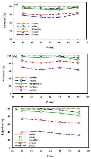 Figure 3a–c shows the results of HSS ions rejection from the MDEA solution (20–45 wt.%) by the NF3 membrane as a function of the operating pressure.