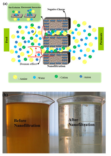 Schematic diagram of the mechanism of ions rejection performance from amine solvent by nanofiltration membrane (a), Samples of amine solution before and after nanofiltration process (b).