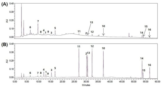 2.4. Isolation and Identification of Compounds 1–16 from EGFOB