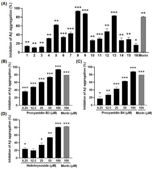 2.5. Inhibitory Effects of Compounds 1–16 from EGFOB on Aβ Aggregation
