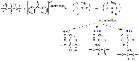 A different example of crosslinking is the application of high molecular weight/commercial PLLA for UV-induced crosslinking [78]. PLLA powders containing different concentrations of benzophenone (2–3.6 mol% per LA repeating unit) were hot-pressed at 190 °C and obtained films were continuously UV irradiated from both sides using different energy. Networks with gel content up to 98.5% have been prepared. By 1H and solid state 13C analyses of pristine PLA, the gel, and soluble fractions of the products, the authors suggested the mechanism of crosslinking which is presented in Figure 3. According to them, the photo-crosslinking may result from the recombination between primary and tertiary carbon radicals generated by the hydrogen abstraction from the PLA chain by the excited benzophenone.