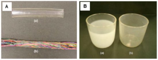 Mitomo, who studied PLA crosslinking by electron beam irradiation for many years (the results are presented in Table 1 in Section 2) [29,30,31,32,33] demonstrated how irradiation improved the thermal stability of cups and plates prepared from poly(L-lactide) and how it enabled the preparation of heat-shrinkable tube which can be used as a cover for electric wire [31]. The tube was prepared by extrusion of PLLA blended with 3 wt % of TAIC at 180 °C and then irradiated at 50 kGy. The irradiated tube expanded two times at 180 °C and its shape was kept at room temperature. After that, the expanded tube shrunk up to the original size by re-heating, thus could bundle wire by heat shrinking. The result is shown in Figure 7A. In another attempt, PLLA with 3 wt % of TAIC was molded to cup and plate by the extruder and irradiated to form a crosslinked structure at 50 kGy. Boiling water was poured into unirradiated and irradiated cups. The unirradiated cup deformed and changed to milky-like transparency, but the crosslinked cup kept its original shape and transparency due to protection from the crystallization of crosslinked structure (see Figure 7B).