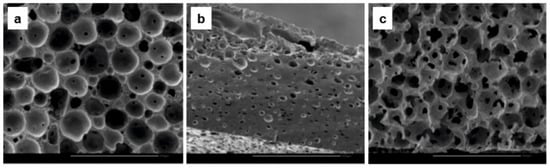SEM images of preparation methods on elastomer scaffold structure: (a) scaffold made using only paraffin microbeads, (b) scaffold prepared using only water emulsified in the polymer solution, (c) scaffold prepared with combined emulsion and paraffin microbeads [91]. (Adapted with permission from Elsevier, 2009).