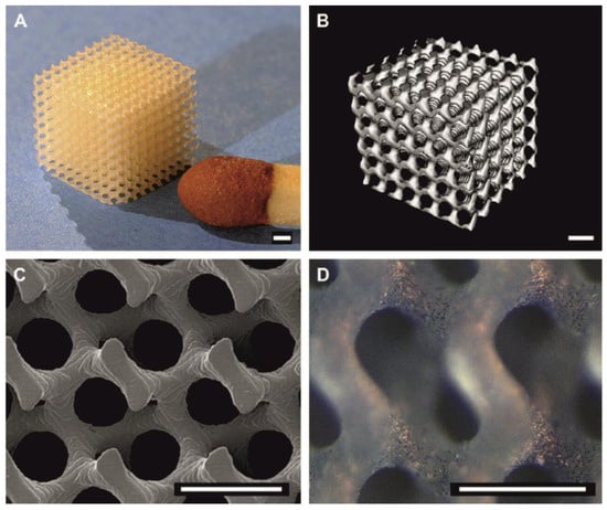 Images of PDLLA network scaffolds with a gyroid architecture prepared by stereolithography: (A) photograph, (B) microcomputed tomography (µCT) visualization and (C) SEM image. In (D) a light microscopy image is shown for a scaffold seeded with mouse pre-osteoblasts after 1 d of culturing. Scale bars represent 500 µm [57]. (With permission from Elsevier, 2009).