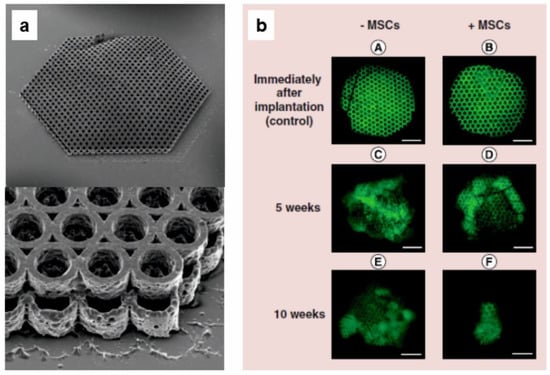 (a) Micrographs of a 2PP-fabricated PLA scaffold, (b) fluorescence of PLA scaffolds after implantation into mice; MSC—mesenchymal stem cell [71]. (Adapted from Future Medicine, 2016).
