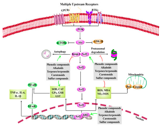 General overview of Nrf2/Keap1/ARE and interconnected pathways, how to be targeted by phytochemicals. Phytochemicals activate Nrf2, ARE (e.g., SOD, CAT, GPx, GSH, GST) and autophagy, while inhibits Keap1, oxidative mediators (e.g., ROS, MDA, NO, iNOS) and inflammation (IL, TNF-α, NF-κB). ↑ green: Activate or up-regulation, ⊥ red: inhibit or down-regulation, ARE: antioxidant response element, CAT: catalase, GPCRs: G protein-coupled receptors, GPx: glutathione peroxidase, GSH: glutathione, GSK-3β: glycogen synthase kinase 3-beta, GST: glutathione S-transferase, IL: interleukin, iNOS: inducible nitric oxide synthase, Keap1: Kelch-like ECH-associated protein-1, MDA: malondialdehyde, mTORc: mammalian target of rapamycin, NF-κB: nuclear factor-κB, NO: nitric oxide, Nrf2: nuclear factor erythroid 2-related factor 2, ROS: reactive oxygen species, RTKs: receptor tyrosine kinase, SOD: superoxide dismutase, TNF-α: tumor necrosis factor-α.
