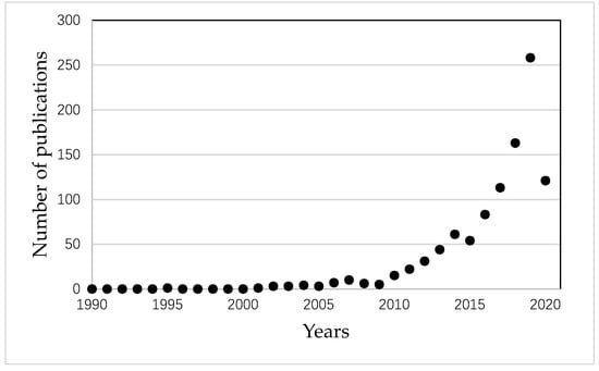 Publication trends from 1990–2020 in the field of carbon-polymer nanocomposites for waste- water treatment (Source: Google Scholar, data extracted on 31.3.2020).