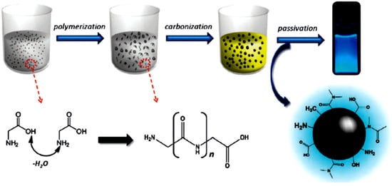 Synthesis of CDs from glycine showing dehydration, polymerization, carbonization and passivation. Reproduced with permission from [50]. Copyright@ The Royal Society of Chemistry 2012.