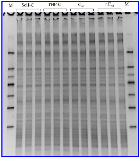 Denaturing gradient gel electrophoresis profiles of 16 S rRNA fragment amplified for three samples from the control soil and soils treated with tetrahydrofuran THF-C (control without carbon), 1 µg of C60 per gram of soil in aqueous suspension and 1000 µg C60 per gram of soil in granular form after 180 days of incubation. M is the marker. Reproduced with permission from [72]. Copyright© 2020, American Chemical Society.