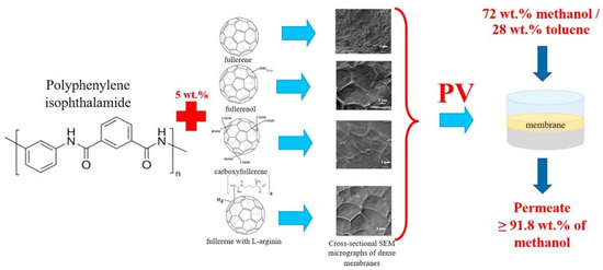 C60 is often chemically functionalized so as to enhance the mixing capability of C60 with other host polymers [93,94]. A sequence of studies have shown that when the polymer membranes are modified with C60, the membranes’ initial properties are improved [95]. The outstanding activity towards the damage by radicals, and excellent thermal as well as antifouling performance are reported. Usage of aromatic polyamides, such as polyphenylene isophthalamide shows promise for NF, UF, distillation, and reverse osmosis. These polymers are mechanically resistant, chemically stable, have low cost, ease of workability and rigidity, and have high porosity [96,97,98,99]. Novel membranes are made using aromatic polyamides, typically modified by polyhydroxylated C60 (fullerenol/C60(OH)n), carboxy C60 and C60 derivatives with L-arginine via a solid phase synthesis route. These C60-modified polyamide membranes show high permeation fluxes and enhanced selectivity [100]. With the modification of aromatic polyamides by C60 derivatives, the structural environment of the polyamide changes (due to the noncovalent bonding between them) and the internal composite membrane structure changes. In addition, it is observed that the surface hydrophilicity, membrane density and surface roughness increases. Figure 6 shows the graphical form of mixed matrix pervaporation (PV) membranes prepared by Dimitrenko et al., and Table 1 shows the PV separation indexes. From Table 1 it can be seen that aromatic polyamide membranes modified with fullerenol shows the best transport properties for the PV of azeotropic methanol-toluene (72/28 wt%) mixtures. In addition, in comparison to other C60 derivatives, membranes containing fullerenol show the highest permeation flux (0.649 kg/(m2h)), and enhanced selectivity with respect to methanol. In another report, a polyphenylene isophthalamide membrane was modified by adding 10 wt% C60 via a solid-phase method to form nano-UF membranes. With the increase in C60 content the membrane rigidity was enhanced and showed improvement in its technological parameters [96]. In addition, polyphenylene isophthalamide with 10 wt% C60 membranes showed increased flux, reduced recovery (0.8–0.9) and lower protein sorption [101]. Polyphenylene isophthalamide with C60 improves the PV properties as well [32]. Furthermore, the physical properties of membranes such as the intrinsic viscosity are significantly influenced by the inclusion of C60 in a polyphenylene isophthalamide matrix. With the inclusion of C60, the structure of the membranes becomes more compact, denser, and reveals a non-monotonic effect on the glass transition temperature.
