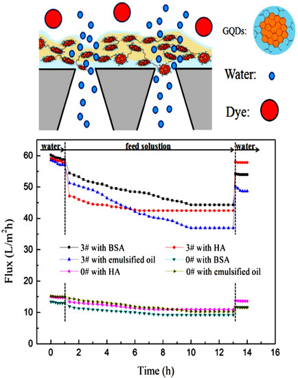 Polyamide TFN membrane made by IP techniques differ in characteristics (higher water flux, separation capability, pH tolerance) from the asymmetric membranes which are formed via phase inversion techniques. Here, it is worth mentioning that particles with larger size allow faster fouling of membranes [121]. Conversely, using ultra-small sized nanoparticles, such as CQDs allow one to significantly enhance the membrane antifouling resistance [122,123]. Li et al. incorporated CDs which are super hydrophilic and have quantum sizes of 6.8 nm into a polyamide layer. The incorporation of such CDs led to higher surface hydrophilicity and water flux for the formed membranes [116]. Bi et al., fabricated TFN membranes incorporated with ~2 nm GQDs via IP of piperazine and trimesoyl chloride. The GQDs were added as aqueous additives into the membranes and poly(ether sulfone) was used as support membrane. Addition of small-sized GQDs efficiently tuned the surface roughness, membrane structure and hydrophilicity of the formed TFN membranes [122]. Figure 7 is a schematic representation of flow of water passing through the membrane channels at the interface between the GQDs and the polyamide layer. These membranes present excellent water permeation, due to a synergistic effect of the surface hydrophilic GQDs. Additionally the graph in Figure 7 shows the antifouling properties of the GQD-based polyamide membranes that are assessed through a dead-end filtration experiment. The foulants used were bovine serum albumin, humic acid and emulsified oil. The results showed that steady water fluxes under harsh fouling conditions could be achieved using GQD-polyamide TFN membranes.