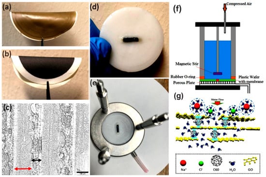 Fabrication process and water desalination setup using C60 grafted graphene oxide membranes. The photograph shows (a) graphene oxide membrane without C60, (b) C60 grafted graphene oxide membrane, (c) is the optical micrograph of the cross-sectional area with scale bar 100 μm. The micrograph shows 148 μm thick graphene oxide laminates (red arrow) embedded in 81 μm thick epoxy (black arrow). Epoxy and graphene oxide-C60 layers are labeled in the figure. (d) graphene oxide-C60 membrane encapsulated with epoxy and glued into a rectangular slot within a plastic disk of 47 mm in diameter, (e) graphene oxide-C60 membrane inside the water desalination setup, (f) and (g) are schematic setup of flat membrane made of graphene oxide and C60 hybrid for water desalination. C60 was grafted between the laminates of graphene oxide. The pressure is applied from the top and when the water passes through the membrane the anion and cation are blocked. Reproduced with permission from [146]. Copyright© 2020, American Chemical Society.