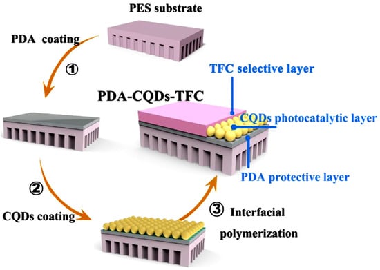 - Shao, D.-D.; Yang, W.J.; Xiao, H.-F.; Wang, Z.-Y.; Zhou, C.; Cao, X.-L.; Sun, S.-P. Self-Cleaning Nanofiltration Membranes by Coordinated Regulation of Carbon Quantum Dots and Polydopamine. ACS Appl. Mater. Interfaces 2020, 12, 580–590. [Google Scholar] [CrossRef]