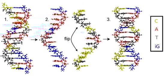 Flowchart depicting the generation of the initial structure with (iso)guanine residues depicted in blue, adenine in red, thymine in grey and cytosine in yellow. 1. Antiparallel-stranded DNA obtained from 3DNA; 2. Separated strands, where one stand is flipped by 180°; 3. Reattached strands forming parallel-stranded DNA.