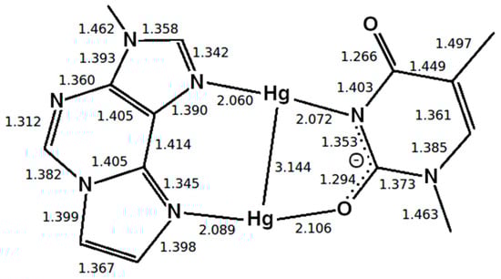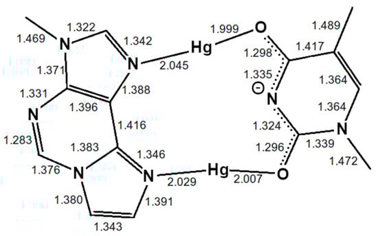Optimized structure of the εA–Hg(II)2–T base pair with interatomic distances in Å. The N3 atom of thymine is deprotonated. Both mercury(II) ions form coordinate bonds involving one nitrogen atom of εA (N6 or N7) and one oxygen atom of T (O2 or O4), resulting in the NO-bonding pattern.