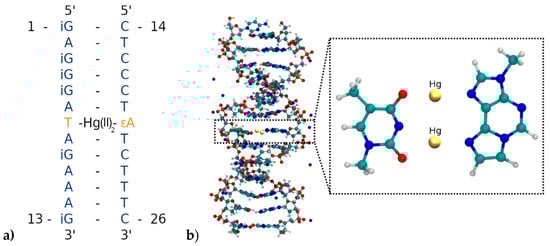 Depending on the type of artificial nucleobase used, even di- and trinuclear metal-mediated base pairs have been reported [,,,]. Recently, the first dinuclear metal-mediated base pair containing two mercury(II) ions as divalent metal ions has been reported []. The artificial nucleobase 1,N6-ethenoadenine (εA) had been employed in those studies because it had been shown to provide a unique coordination mode, with the lone pairs of its two coordinating nitrogen atoms being oriented in an almost parallel fashion. As a result, εA is particularly suited for binding two metal ions at close distance to each other. Hence, the use of εA allowed for the first time the arrangement of two Hg(II) ions (bearing four positive charges) in a single metal-mediated base pairs. The bonding pattern of the resulting εA–Hg(II)2–T base pair has been explored at the Density Functional Theory (DFT) level for isolated base pairs []. Later, a slightly different geometry has been proposed for this base pair []. As mercury features a multitude of possible bonding patterns within DNA [], we decided to study the bonding within this mercury(II)-modified DNA by the means of QM and QM/MM simulations. As no empirical structures of the solvated DNA duplex were available, we employed the so-called dynamic distance constraint [] to find an initial geometry of the DNA in the preferred hydrogen bonding pattern. After this initial phase, all constraints are released for a further optimization, which preserved the hydrogen bonding structure.
