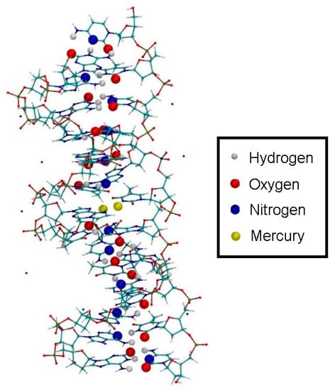 - Onyido, I.; Norris, A.R.; Buncel, E. Biomolecule-Mercury Interactions: Modalities of DNA Base-Mercury Binding Mechanisms. Remediation Strategies. Chem. Rev. 2004, 104, 5911–5929. [Google Scholar] [CrossRef]