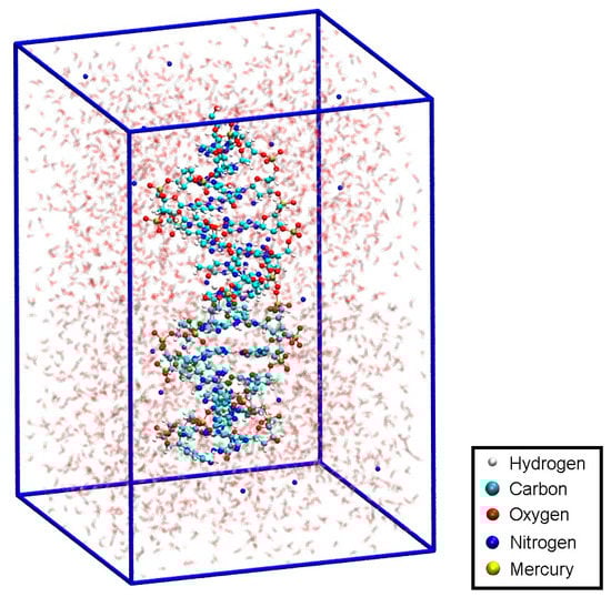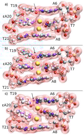 Simulated annealing starting from the NPT-equilibrated temperature of 300 K was applied during the subsequent 30,000 steps with an annealing factor of 0.99 to slowly relax the DNA duplex. This was followed by a QM/MM geometry optimization [,] using CP2K with all constraints released. The computational details are given in Section 2.5.