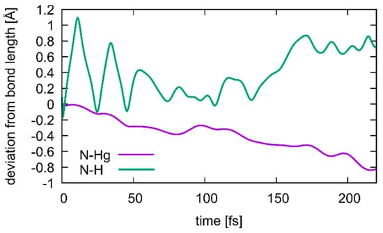DFT based ab initio molecular dynamics simulations were carried out with the CP2K program using the GAPW scheme [,]. The PBE functional was chosen together with the TZVP-MOLOPT basis set for all atoms except mercury, for which a DZVP-MOLOPT basis was utilized [], in conjunction with Goedecker–Teter–Hutter pseudopotentials [,,] and a plane wave cut-off of 400 Ry. Grimme D3 dispersion corrections were employed with Becke–Johnson damping [,]. A total of 700 virtual molecular orbitals were calculated for Fermi-Dirac smearing due to the presence of the transition metal mercury. Cholesky inversion was chosen as the solver of the eigenvalue problem, while Broyden mixing was employed for optimization. MD was performed with a time step of 0.5 fs.