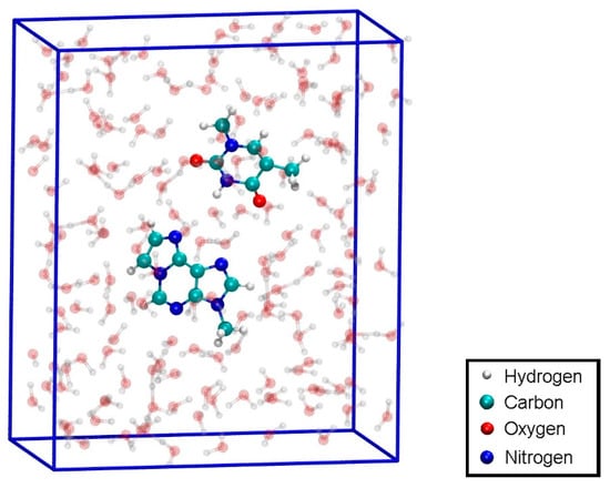 To have access to an all-QM calculation, the isolated modified base pair without Hg (Figure 1b) was solvated by 168 water molecules (Figure 11). The computational details are given in Section 2.3. The force field allowed for a 150 ps NPT equilibration simulation of the solvated base pair. This resulted in a unit cell of size 11.2 Å × 24.2 Å × 20.4 Å, corresponding to a density of 1037 kg/m3. This geometry will be referred to as structure 4.