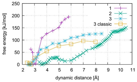 - Burisch, C.; Markwick, P.R.L.; Doltsinis, N.L.; Schlitter, J. ‘Dynamic Distance’ Reaction Coordinate for Competing Bonds: Applications in Classical and Ab Initio Simulations. J. Chem. Theory Comput. 2008, 4, 164–172. [Google Scholar] [CrossRef] [PubMed]