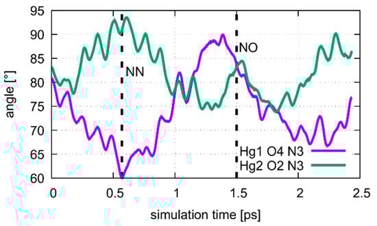 Dynamics of the Hg1···T7O4···T7N3 and Hg2···T7O2···T7N3 angles during the oscillation of patterns of the metal-mediated base pair during the QM/MM MD of structure 2 at DDNA = 3.8 Å. The NN pattern can be identified after 0.6 ps, corresponding to the situation in Figure 13a. At 1.5 ps the system is in the NO pattern, depicted in Figure 13b.