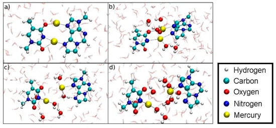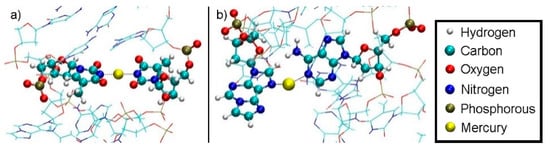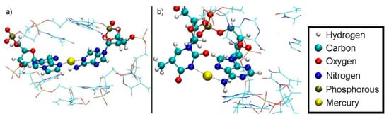 Within structures 1 and 2, the Hg(II) ions did not leave the DNA during the dissociation simulation, but changed their bonding pattern. However, structure 1 exhibited a dissociation path that allowed Hg2 to get into contact with water. This dissociation path can be analysed as follows. From the initial geometry of being situated within the modified base pair, the final geometries for structure 1 at DDNA = 5.8 Å showed Hg2 in an A6–Hg(II)–εA20 environment (Figure 15a). The median distances from Hg2 to the coordinated nitrogen atoms are 2.15 Å to εA20-N6 and 2.17 Å to A6-N1. Hg1 is involved in a T7–Hg(II)–A8 pair dangling on the side of only one strand with a median distance from the coordinated nitrogen atoms to Hg1 of 2.17 Å (T7-N3) and 2.12 Å (A8-N6) (Figure 15b). These values suggest the formation of coordinate bonds to the Hg ions. The NH2 group of A8 changes its hybridization from a sp2-like planar state to a sp3-like tetrahedral state, with Hg1 acting as the fourth binding partner. Such a hybridization shift of the exocyclic amino group of adenine has been reported before in structurally characterized metal complexes [].