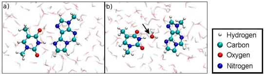 All computed free energy differences lie in the range of 100–200 kJ/mol, which are typical binding energies of DNA base pairs []. These calculated energies correspond to the dissociation process depicted in Figures S1–S3 for the simulations of the whole DNA and to the binding energy of the isolated base pair in water from Section 4.2. As the simulated partial dissociation in the whole DNA mainly affects the modified base pair, the calculated energies are indicative of the amount of energy required to induce the observed change of bonding patterns within the modified base pair.