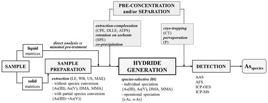 The speciation of As by HG in sample solutions containing various inorganic and organic species is challenging, because several factors affecting the efficiency have to be carefully controlled to improve the accuracy. In reference to this, the present review covers the speciation of As in various matrices including environmental, industrial, food, biological and clinical samples using the non-chromatographic approach, based on the HG technique, and combined with different spectrochemical detection methods. It illustrates the main aspects of proper sample preparation before analysis and the choice of an adequate strategy for speciation (see Figure 1). Analytical methodologies for As speciation by HG are categorized according to their analytical performance, advantages and problems. Different non-chromatographic procedures, along with the speciation protocols reported in the literature over the past 20 year, are summarized. Additionally, the role of specific extraction–complexation, retention and co-precipitation enrichment methods before HG, in addition to the separation of evolved hydrides in cold traps or pervaporation modules to improve the detectability of As species and the selectivity of measurements, are discussed. Finally, alternative methods to conventional wet chemical HG providing selective generation of As hydrides are presented.