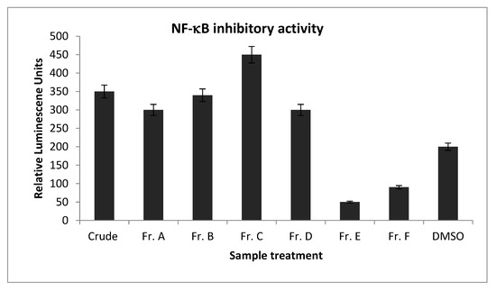 The effect of the crude extract (5 mg/mL) and the HP20 open column fractions (Fr. A–F, 5 mg/mL) of noni fruit juice on NF-κB in HepG2 cells. The negative control was 0.2% DMSO (mean ± SD).