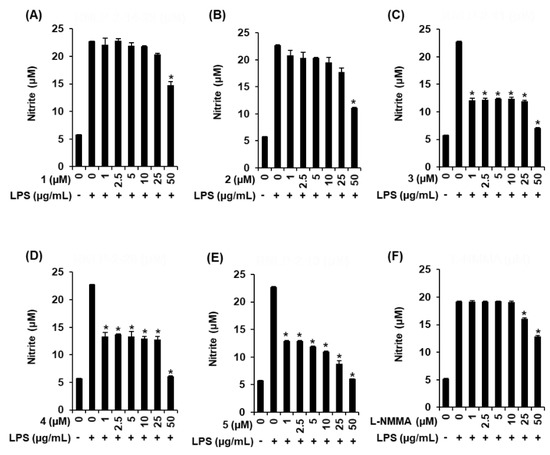 Comparison of inhibitory effect of the isolated compounds 1–5 and L-NMMA on LPS-induced nitric oxide (NO) production in RAW 264.7 macrophages. (A–F) The inhibitory effect of compounds on NO production was investigated using the Griess reagent (mean ± SD, * p < 0.05 compared to the LPS-treated group). In the graphs description, “+/-” means with/without LPS in the RAW 264.7 macrophages treatment for production of NO.