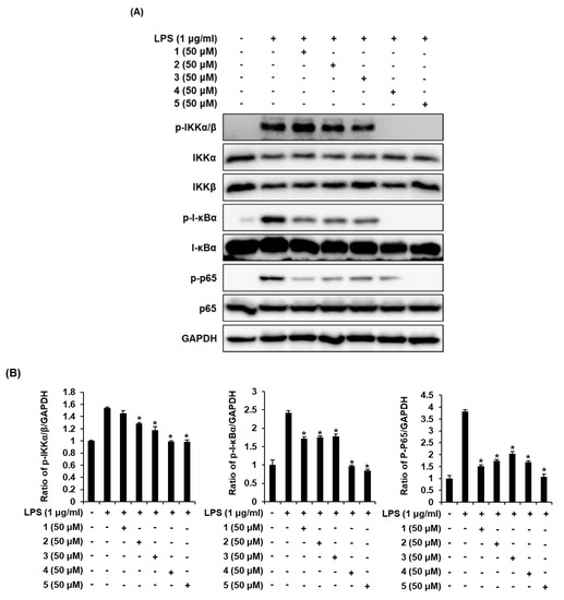 Comparison of effects of isolated compounds 1–5 on the LPS-induced protein expression of I-κBα, IκB kinase (IKK)α/β and NF-κB p65 in RAW 264.7 macrophages. (A) Representative Western blots for I-κBα, IKKα/β, NF-κB p65, and GAPDH protein expression. (B) Quantitative graph for Western blots (mean ± SD, * p < 0.05 compared with the LPS-treated group). In the graphs description, “+/-” means the protein expression of RAW 264.7 macrophages with/without LPS or sample (compounds 1–5) respectively.