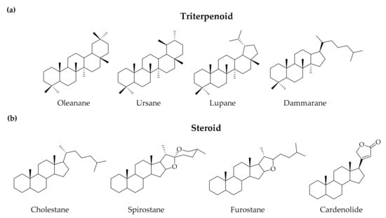 The name “saponin” is derived from the Latin word sapo, meaning soap-like foam-generating ability, and the amphiphilic properties derived from the structure containing an isoprenoid-derived aglycone (a sapogenin) attached to one or more sugar chains by either an ether or ester linkage. Structural classification of saponins is primarily based on their sapogenin skeletons, which can be divided into two main groups—Triterpenoid saponins and steroid saponins [1,2]. Triterpenoid saponins are broadly distributed in dicotyledons, including four major skeletons—Pentacyclic oleanane, ursane, lupane, and tetracyclic dammarane (Figure 1a); steroid saponins are mostly derived from monocotyledons, comprised of four major skeletons—Tetracyclic cholestane, hexacyclic spirostane, pentacyclic furostane, and lactone-bearing cardenolide (Figure 1b). Sugar-bearing sapogenins are categorized by numbers of sugar residue in monodesmosidic (one sugar residue), bidesmosidic (two sugar residues), and polydesmosidic saponins (three or more sugar residues) [3].
