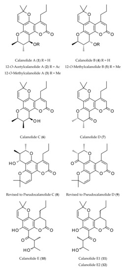 Calanolides are tetracyclic 4-substituted dipyranocoumarins, and their C-ring contains a gem-dimethyl group (Figure 1), e.g., (+)-calanolide A (1), (−)-calanolide B (costatolide) (14) (Figure 2). The discovery of calanolides from the leaves and twigs of the tree Calophyllum lanigerum var. austrocoriaceum (Whitmore) P. F. Stevens, collected from Sarawak, Malaysia in 1987 happened during one of the largest anti-HIV screening programs conducted by the National Cancer Institute (NCI) during 1987–1996. In that program, over 30,000 plant extracts were screened utilizing an in vitro cell-based anti-HIV screen that could determine the degree of HIV-1 replication in treated infected lymphoblastic cells versus that in treated uninfected control cells [1,2]. Calanolide A (1) (Figure 1), which can be described as a 11,12-dihydro-2H,6H,10H-dipyrano[2,3-f:2′,3′-h]chromen-2-one substituted by a hydroxyl (–OH) group at C-12, methyl groups at positions 6, 6, 10 and 11 and a propyl group at C-4 (the 10R,11S,12S stereoisomer), was isolated as the first member of anti-HIV compounds, calanolides, as a potential novel therapeutic option for the treatment of HIV infections. However, a subsequent attempt to recollect this plant sample failed and the collection of other specimens of the same species (not necessarily the same variety), afforded only a negligible amount of calanolide A (1). In fact, calanolides are among the first plant-based compounds to demonstrate potential anti-HIV-1 activity. Later, an extract of the latex of C. teysmanii showed significant anti-HIV activity in the screening, but the major active compound was (−)-calanolide B (14, also known as costatolide), regrettably not calanolide A (1) (Figure 2). The anti-HIV activity of (−)-calanolide B (14) was less potent than that of calanolide A (1), possibly because of difference in stereochemistry at the chiral centers. To date calanolides A-F and some of their methyl, acetyl and dihydro derivatives have been reported mainly from various Calophyllum species (Figure 2). Among these, the structures of calanolides C (6) and D (7), as reported initially by Kashman et al. [1] from C. lanigerum, were revised and renamed as pseudocalanolides C (8) and D (9) [3] (Figure 2). However, the true calanolides C (6) and D (7) were later reported from C. brasiliense Cambess. [4,5,6].